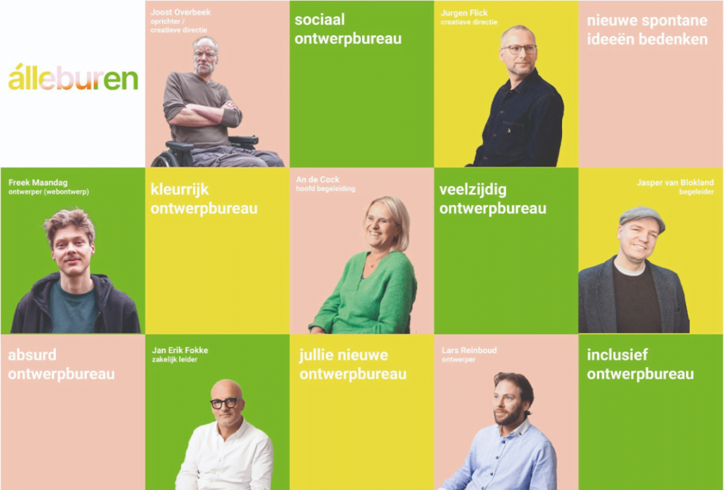 Joost Overbeek, oprichter van álleburen, neemt ons mee in een inspirerend verhaal over zijn grafisch ontwerpbureau en ontwikkelplek voor mensen met een afstand tot de arbeidsmarkt. Vijf jaar geleden startte Joost met álleburen, een bureau waar jongeren tot 35 jaar, die via de reguliere weg weinig kansen krijgen, de mogelijkheid hebben om leer- en werkervaring op te doen in een ontwerpbureau. Ze bouwen zelfvertrouwen op, ervaren dat een (on)zichtbare beperking het werken als ontwerper niet in de weg hoeft te staan en nemen (opnieuw) regie over hun leven. Samen werken ze aan huisstijlen, websites, campagnes, illustraties en animaties.